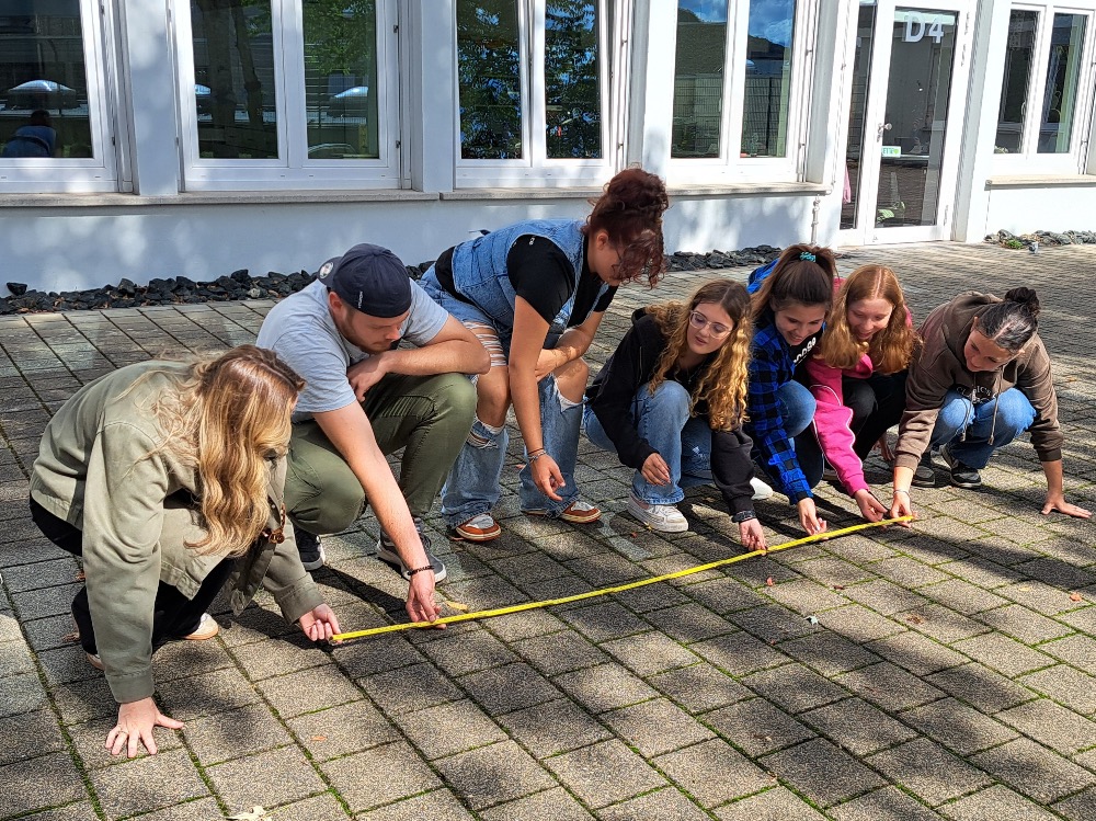 Im Fokus standen: sich besser Kennenlernen, Vertrauen aufbauen und im Team handeln. Nach dem Einstieg ("das schwebende Tischtuch"), bei dem die Klasse ein Glas Wasser quer über den Schulhof transportierte - auf dem Rückweg teils sogar mit verbundenen Augen - durften sich die angehenden ErzieherInnen beim Holzklötze stapeln ("Föbelturm") ausprobieren. Zuletzt stellten die TeilnehmerInnen fest, wie schwierig es ist, sich im Team zurückzunehmen um den "fliegenden Zollstock" einfach nur vom Boden aufzuheben, ohne dabei Team-Mitglieder zu verlieren.